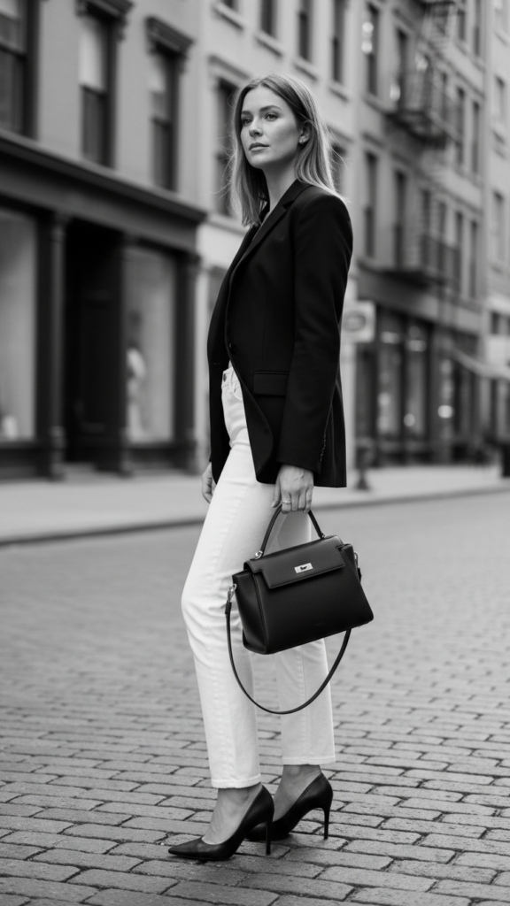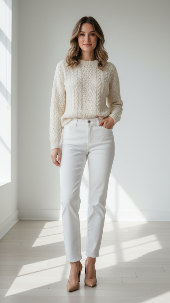 Choose a fitted knit top in cream, soft gray, or muted beige to complement your white denim. Tuck it partially for structure while maintaining comfort throughout your workday. Nude pumps elongate your legs and create a cohesive silhouette that’s appropriate for client meetings or office presentations.