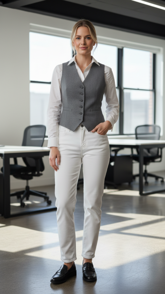 For a more structured and polished approach to your white jeans ensemble, layering a fitted vest over a long-sleeve shirt creates sharp, professional lines that command respect in any office setting. You’ll break free from typical blazer constraints while maintaining executive presence through strategic layering.