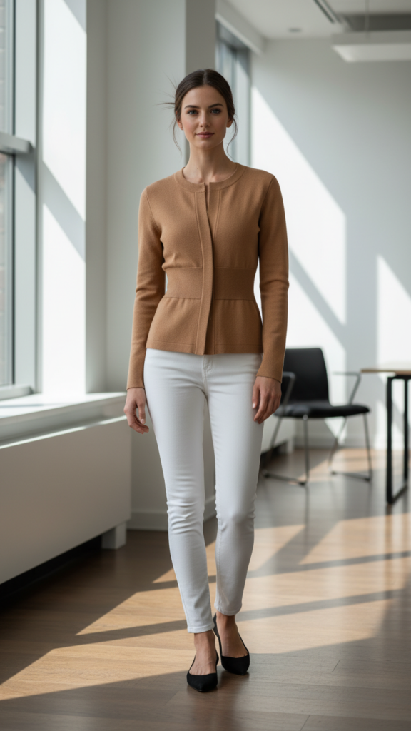 Choose cardigans with defined shoulders or customized waistlines that complement your white jeans’ clean lines. Pointed-toe flats elongate your legs and add sophistication without sacrificing comfort. Black, navy, or camel cardigans work beautifully, creating sleek silhouettes that move seamlessly from meetings to after-work events.