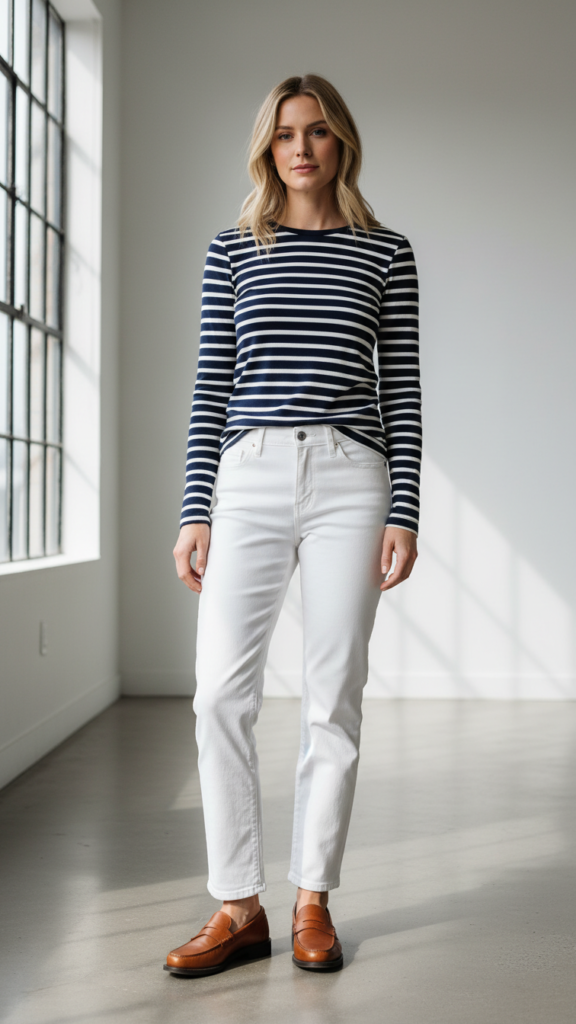 This crisp pattern mixing works beautifully when you balance proportions—choose fitted stripes with relaxed white jeans or vice versa. Complete your look with leather loafers in cognac, black, or navy for instant sophistication.