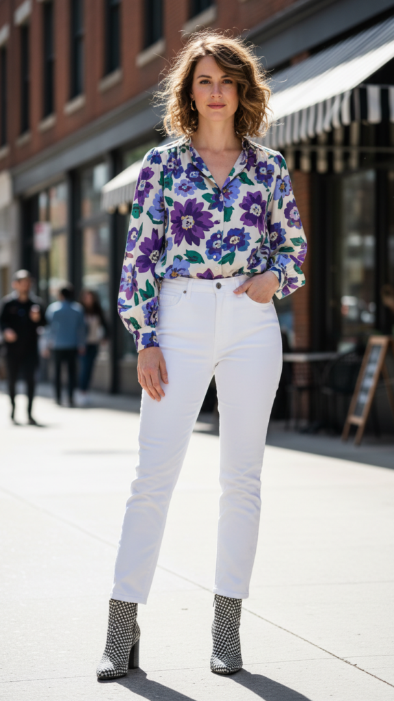 Printed blouses instantly uplift white jeans from casual to office-appropriate, offering endless pattern possibilities that showcase your personal style while maintaining professionalism. Choose florals, geometric designs, or subtle stripes that complement your workplace culture without overwhelming your silhouette.