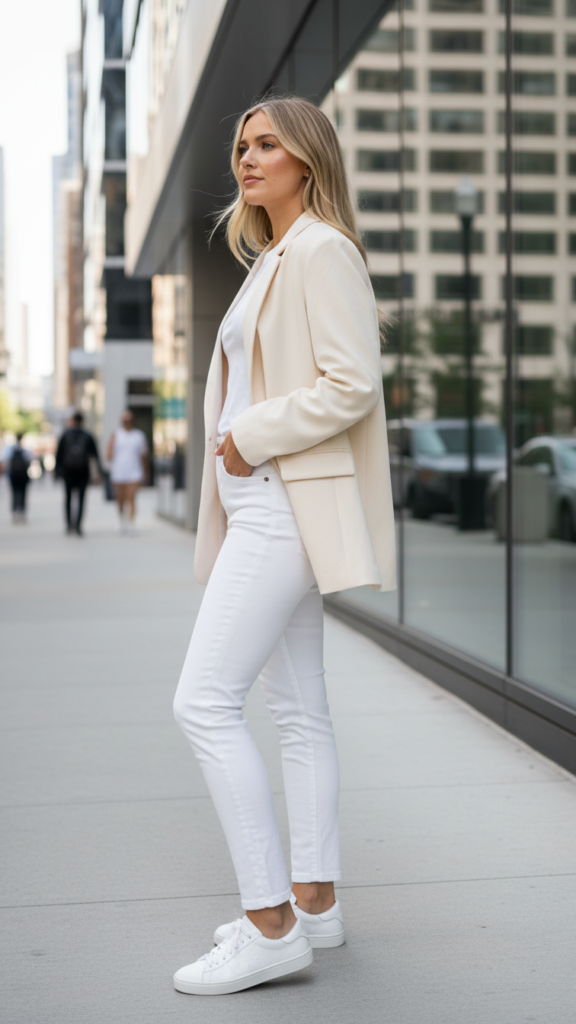 For casual Fridays, swap the blazer for a relaxed denim jacket while keeping the same sneakers. This combination delivers comfort without sacrificing polish, making it suitable for creative workplaces or flexible dress codes.