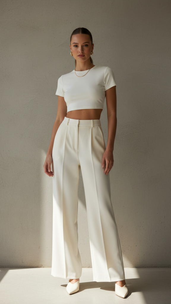 This combo is for when you want to look put together but also want to show a little skin. High-waisted wide-leg trousers in white create the longest leg line ever, and a fitted crop top balances everything out perfectly. It’s structured but still fun.