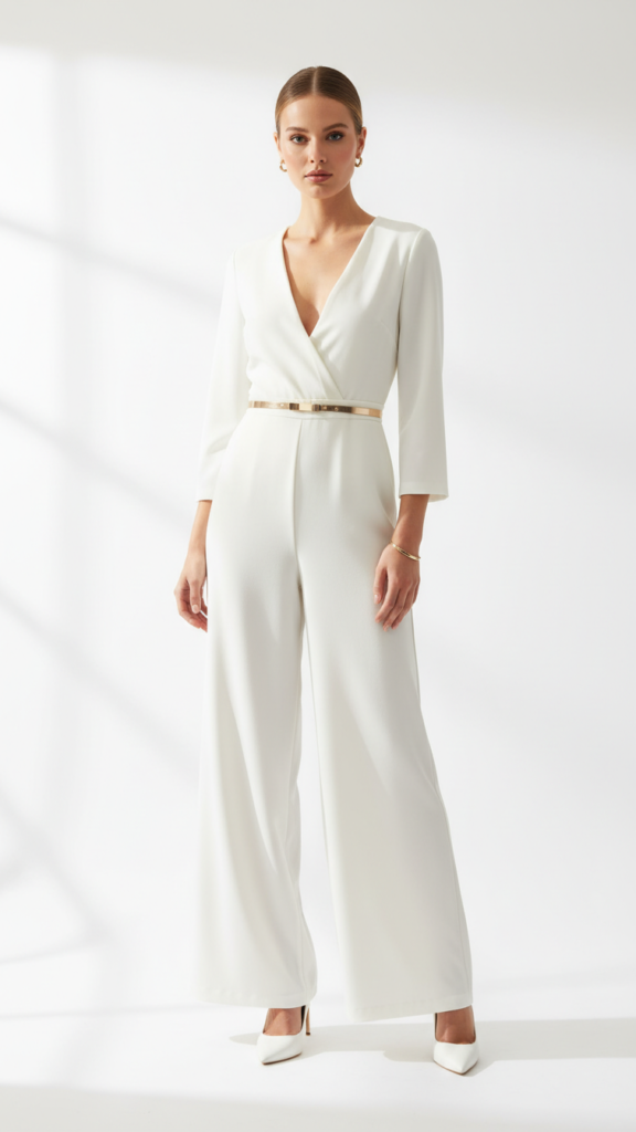 If you want to walk in looking like you mean business, a white jumpsuit is your answer. There’s something about a one-piece outfit that just feels powerful. No coordinating required. Just zip up and go.