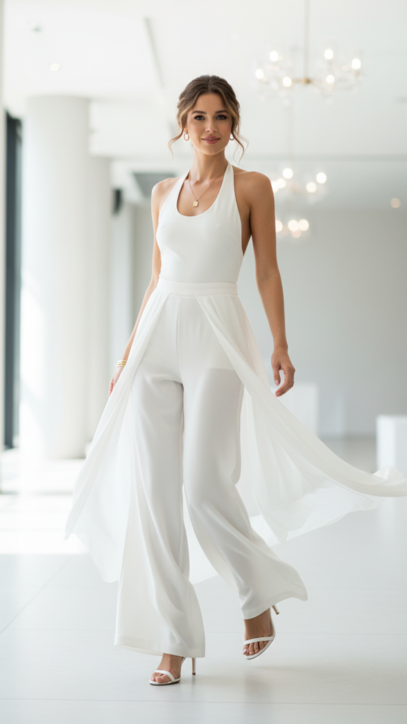 The halter draws attention upward while the wide legs create movement and flow. It’s balanced. It’s elegant. It photographs ridiculously well. Go for interesting textures here like a ribbed halter or pants with subtle pleating. The visual interest comes from the shapes and fabrics, not accessories.