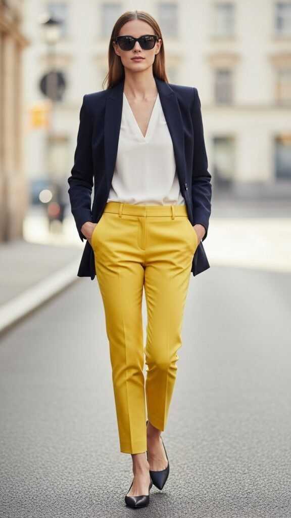 Want to look like you have your life together even when you absolutely do not? Throw a structured navy blazer over those yellow trousers and watch the magic happen. Navy and yellow is one of those color combos that just works. It’s preppy without being stuffy, polished without trying too hard.