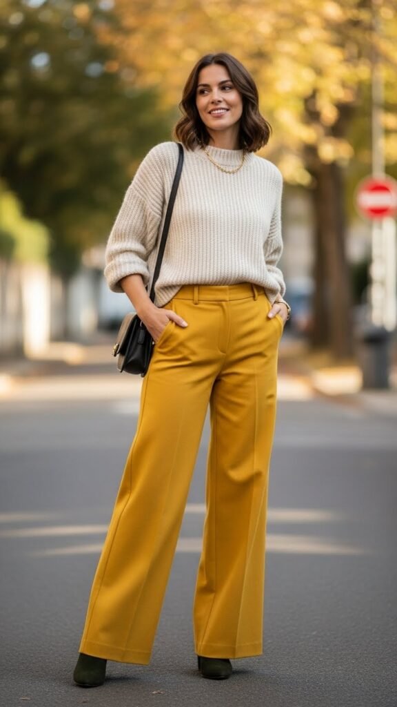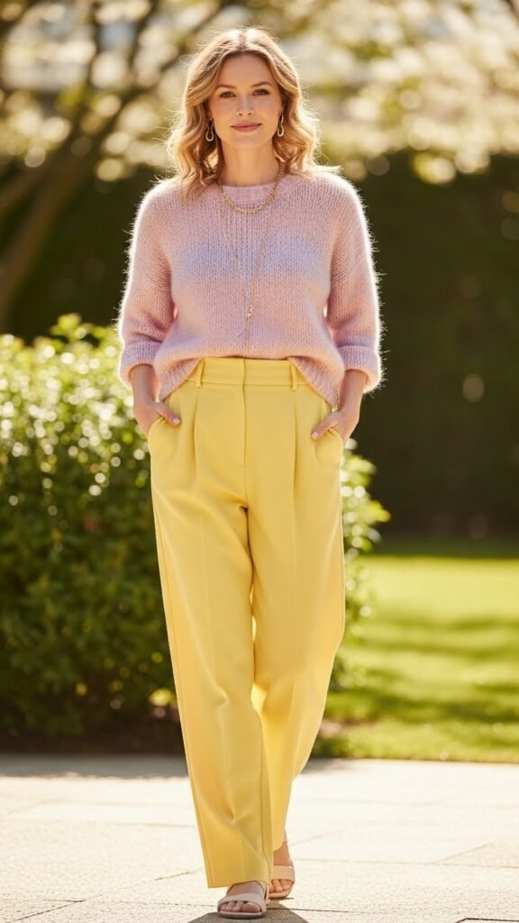 If you’re new to the yellow trouser game and want something gentle, try pairing them with pastels. A soft pink, lavender, or baby blue sweater creates this dreamy, approachable combination that’s feminine without being overwhelming.
