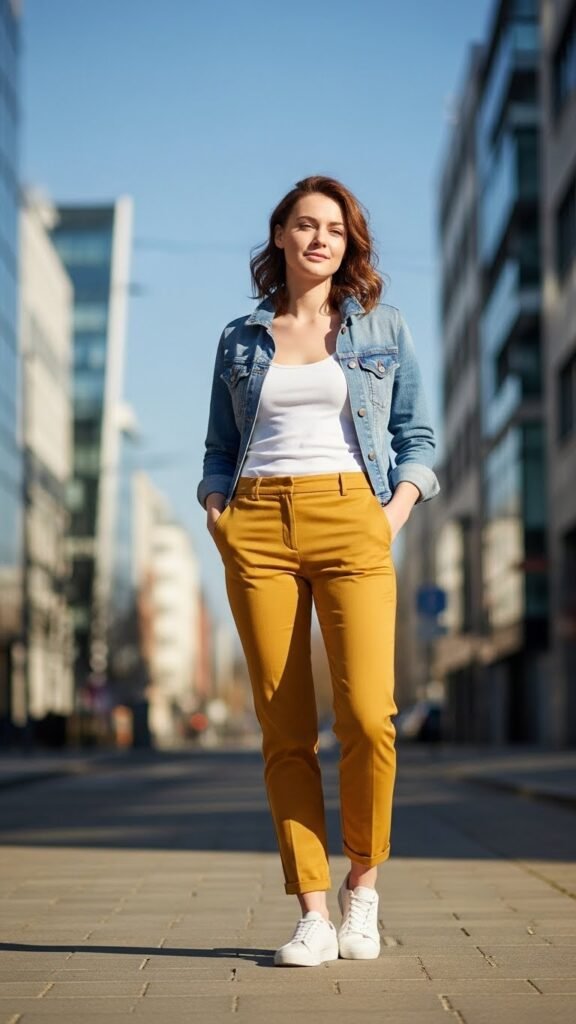 Denim jackets go with everything. This is not an opinion. This is a fact. And when you layer one over yellow trousers and a simple tank or tee, you get this relaxed, weekend-ready vibe that feels effortless but still stylish.