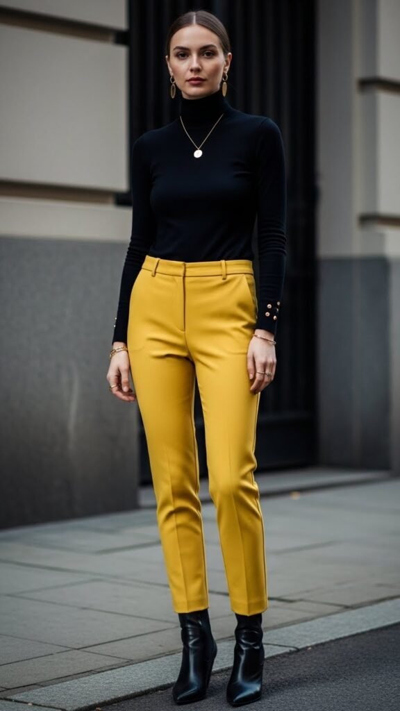 If you want to feel like a chic European art curator, this is your moment. A black turtleneck with yellow trousers is sophisticated, modern, and gives off major “I have impeccable taste” energy. The dark top makes those bright pants pop even more.