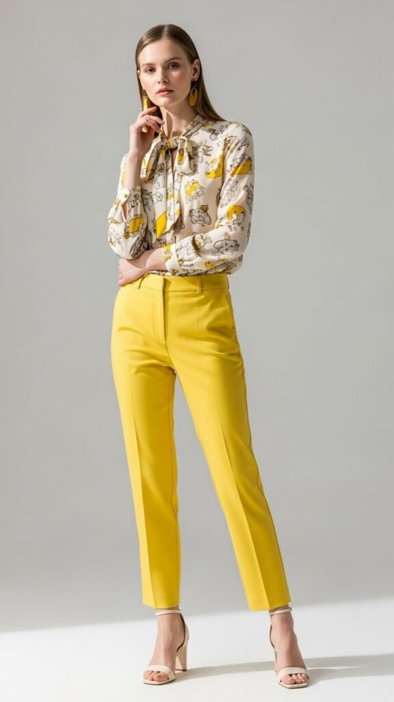 Feeling brave? Let’s talk about prints. A floral or abstract printed blouse with yellow trousers sounds like a lot, but when done right, it’s absolutely stunning. The trick is making sure yellow appears somewhere in the print so everything ties together.