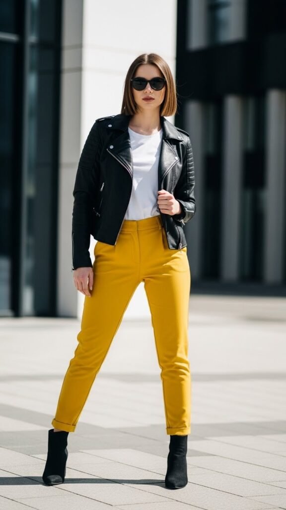 Want to toughen up those sunny trousers? Enter the leather jacket. A black moto jacket over yellow pants creates this unexpected contrast that’s edgy without being intimidating. It’s like sunshine with a hint of rock and roll.